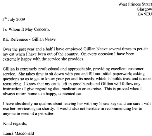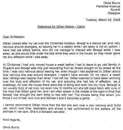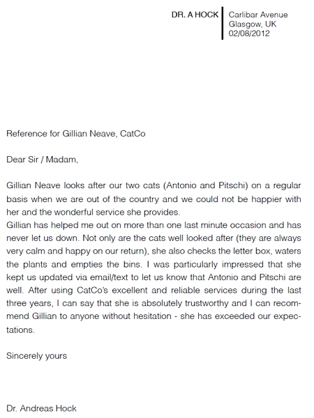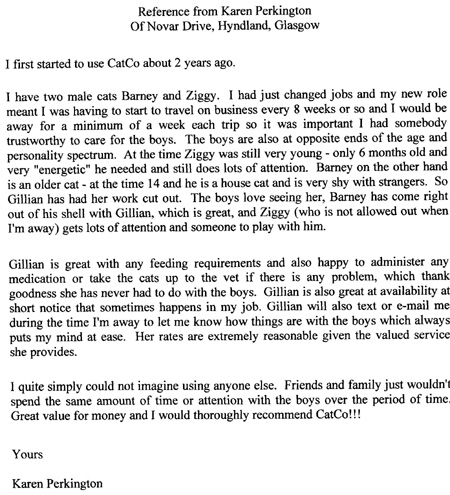 "We can go on holiday safe in the knowledge that our cat receives regular attention from a fellow cat lover, with no disruption to his routine or environment." full reference